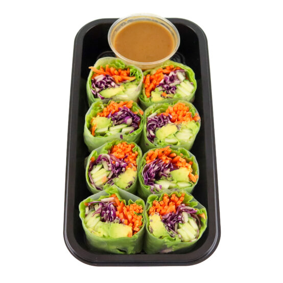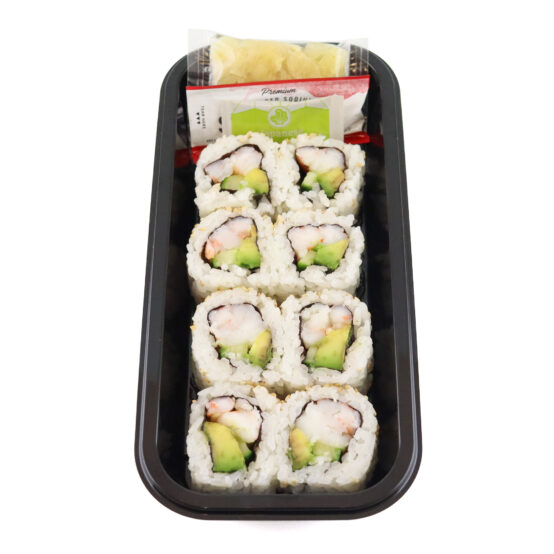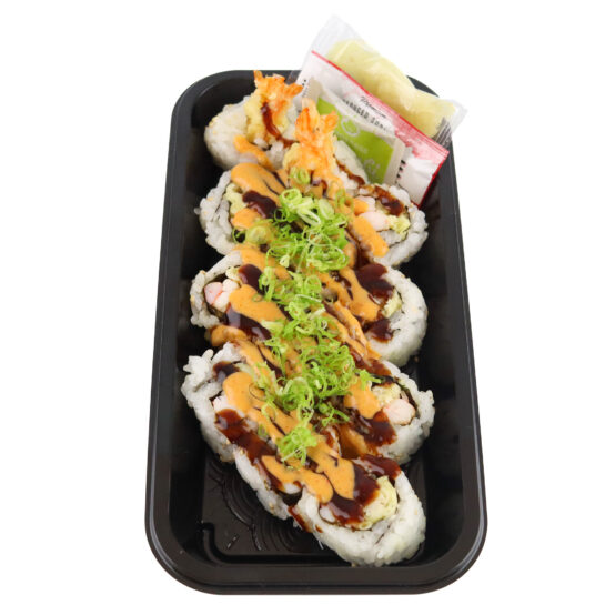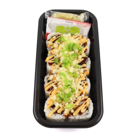 Crabstick (Alaskan Pollock), Avocado, Cucumber, Seasoned White Rice, topped with Spicy Sauce, BBQ Sauce, Crunchy Tenkasu and Green Onion